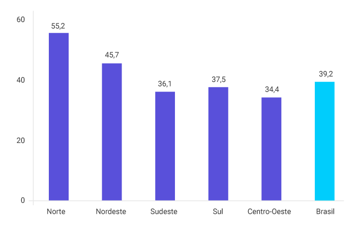 Em 2019, o índice de perdas de água no Brasil foi de 39,2%. Isto significa que a cada 100 litros produzidos, cerca de 39 litros deixaram de ser consumidos. Este é o percentual do volume de água que foi perdido durante a distribuição, por motivos de vazamentos nas tubulações, ligações clandestinas ou falhas no sistema de medição do consumo. As maiores perdas aconteceram na região Norte e Nordeste, 55,2% e 45,7% respectivamente. Veja a Figura 1.