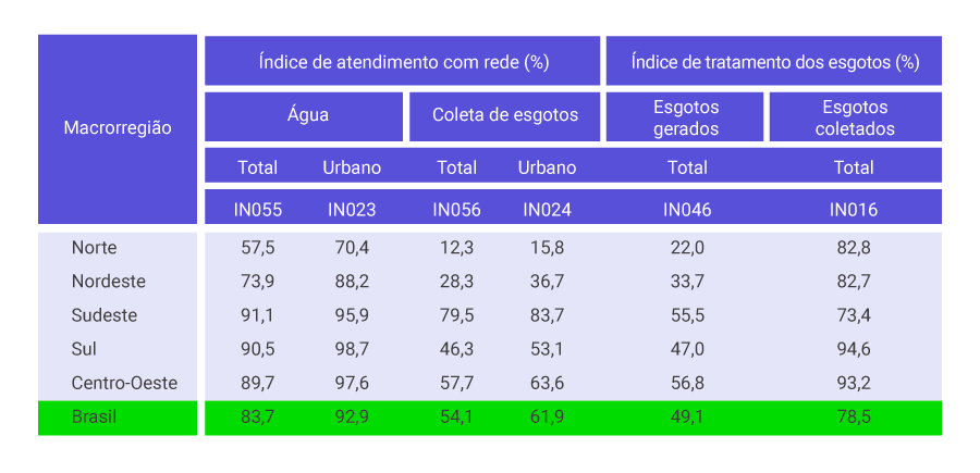 Segundo dados do diagnóstico dos serviços de água e esgoto elaborados pelo Sistema Nacional de Informações Sobre Saneamento (SNIS), em 2019, a cobertura do serviço de água tratada no país registrou 83,7% e apenas 54,1% do esgoto gerado foi coletado. Em outras palavras, mais de 100 milhões de habitantes não possuem acesso ao serviço de coleta de esgoto e, aproximadamente, 35 milhões de pessoas vivem sem água tratada.